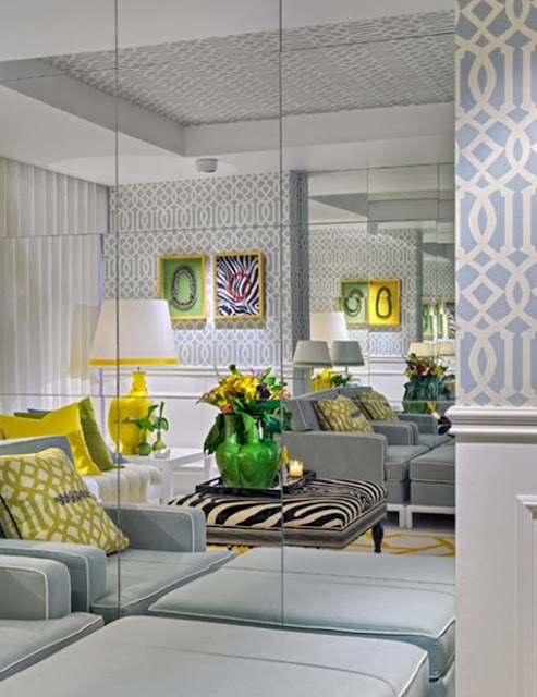Recall the breath-taking designs by Maria Barros yesterday. I'm back today to share more. There are just too many wonderful photos I had to share. Loving the grey trellis wallpaper in the first photo. And the continued use of the covering on the ceiling is brilliant (I'm all about treating the ceiling with love, more of that here). Maria uses a lot of color with an unexpected mix of patterns (e.g., zebra with hexagons). But I absolutely love it. She finds the perfect balance and mix in her designs. It's certainly not for everyone...but it's definitely right up my alley! Also love the primary colors used in the second room. The wallpaper's bold stripes, the crisp white sofa and dining table with pops of strong colors. Love love love!!!